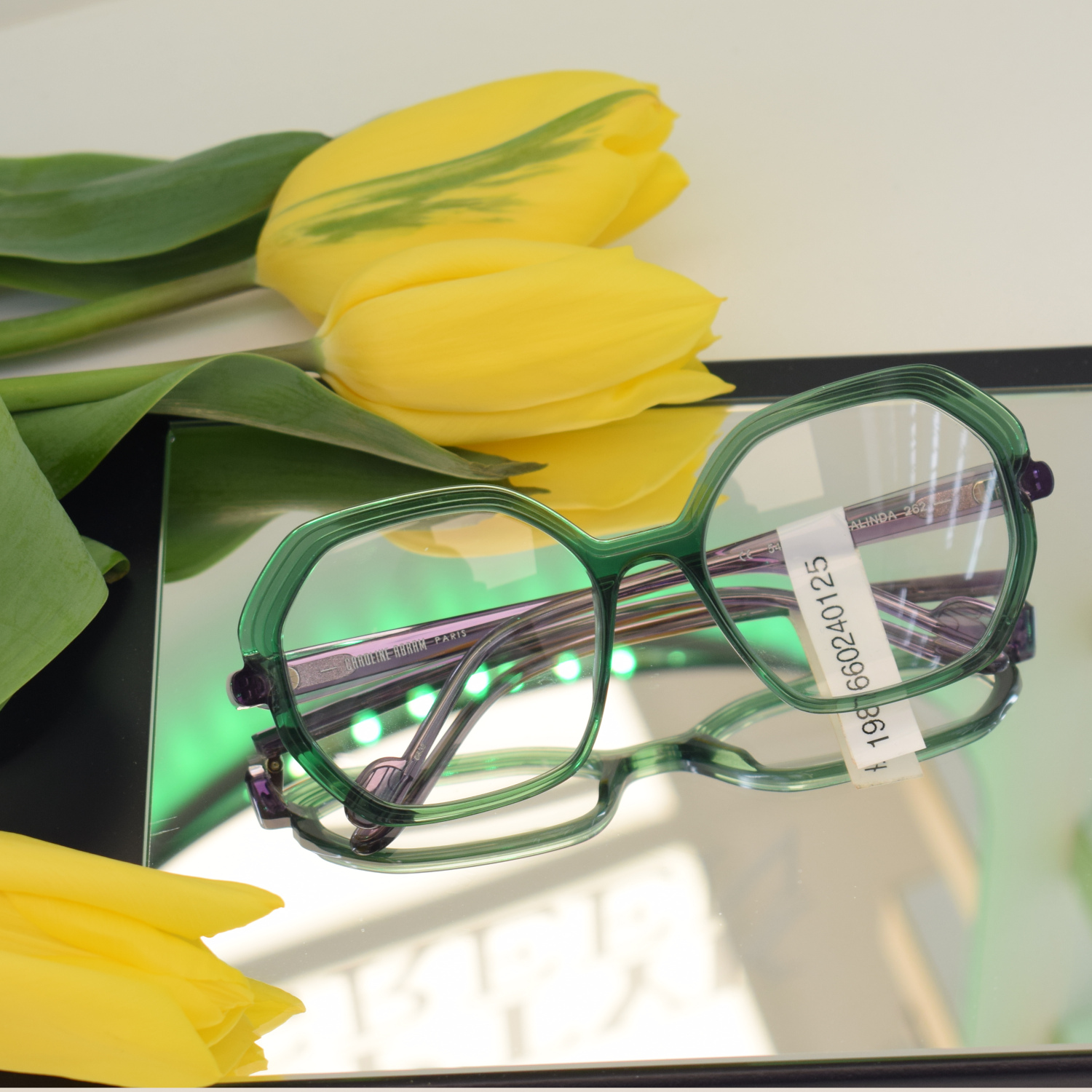 Świeża, jasna kolorystyka najlepiej współgra z osobami o typie kolorystycznym zima. Transparentny zielony front pięknie podkreśla chłodną, ciemną urodę, a fioletowy zausznik dodaje całości nowoczesnego, kolorowego akcentu.