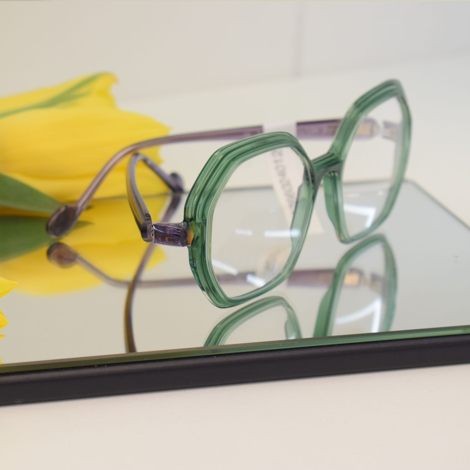 Te oryginalne damskie okulary o geometrycznym kształcie to model, który przyciąga uwagę nowoczesnym designem i świeżą kolorystyką. Oprawki wykonane są z lekkiego tworzywa w transparentnym zielonym kolorze, który nadaje twarzy lekkości i subtelnie podkreśla rysy. Całość uzupełnia transparentny fioletowy zausznik, który wprowadza ciekawy akcent kolorystyczny i nadaje oprawkom modowego charakteru.