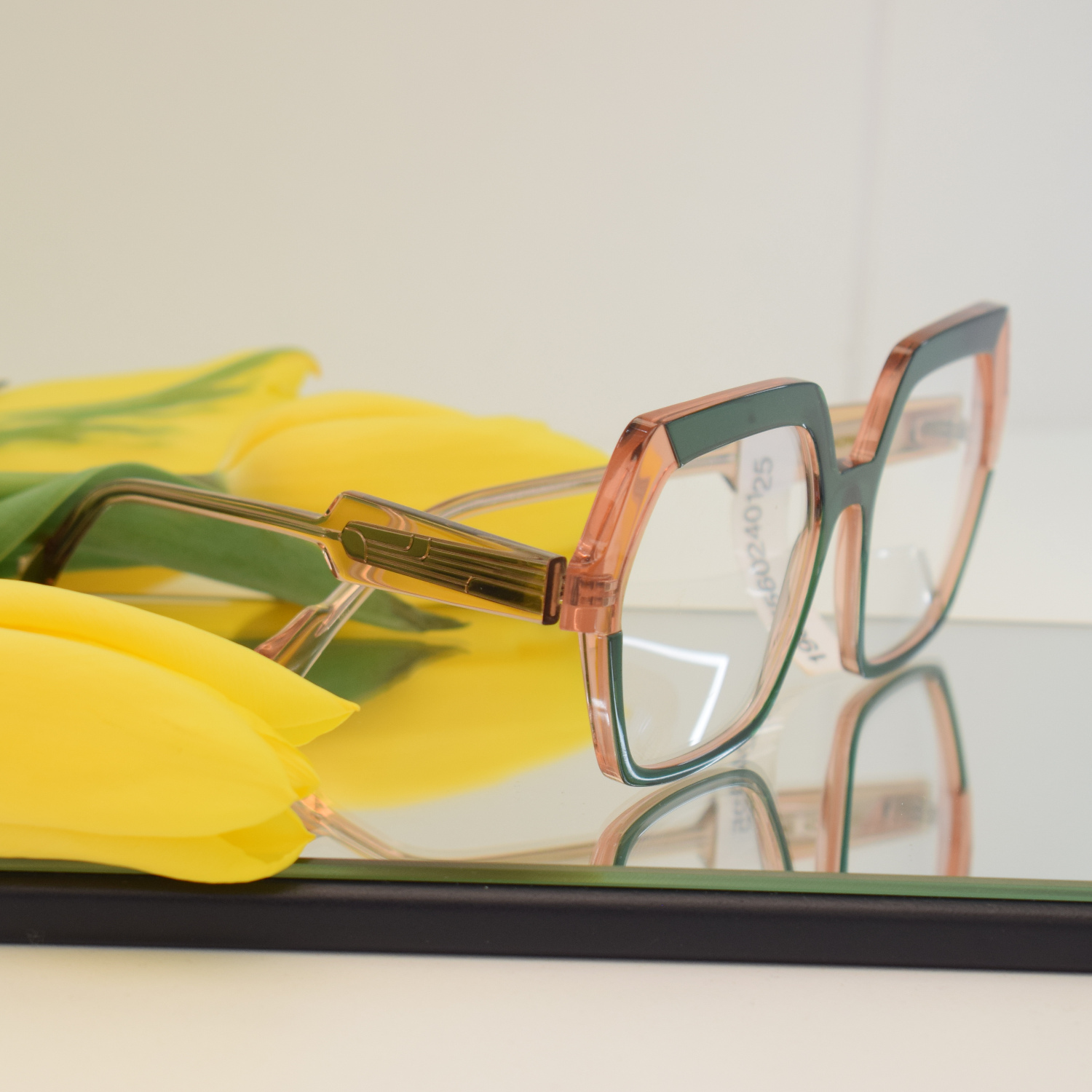 Te nowoczesne damskie okulary o geometrycznym kształcie to model, który przyciąga uwagę wyrazistą formą i ciekawym połączeniem kolorów. Front oprawki wykonany jest z tworzywa w transparentnym zielonym kolorze, który został wzbogacony akcentem ciepłego różu. Takie zestawienie barw nadaje oprawkom modowego charakteru i sprawia, że model wygląda bardzo stylowo. Całość uzupełnia transparentny zausznik w cielistym odcieniu, który nadaje oprawkom lekkości i elegancji.