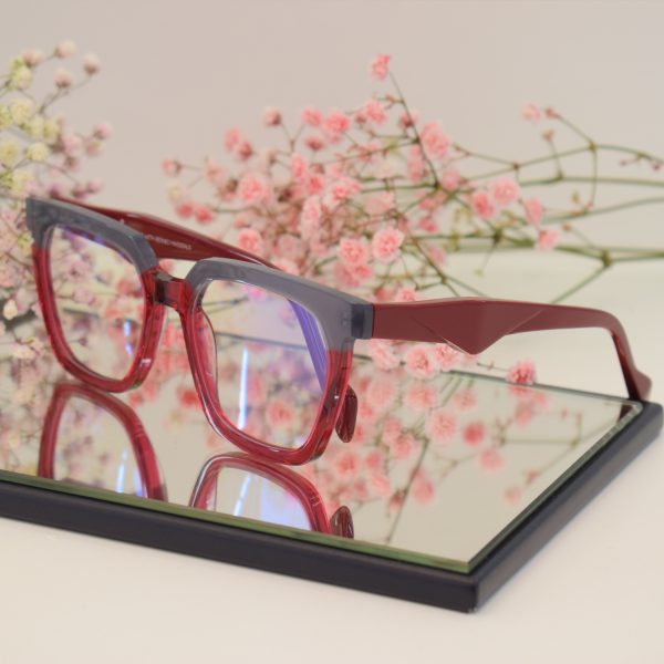 Te nowoczesne damskie okulary o prostokątnym kształcie wyróżniają się wyrazistą kolorystyką i bardzo ciekawym połączeniem barw. Front oprawek wykonany jest z transparentnego tworzywa w czerwonym kolorze, który od górnej części został przełamany eleganckim szarym akcentem. Całość uzupełniają bordowe zauszniki, które nadają modelowi głębi i wyjątkowego charakteru.